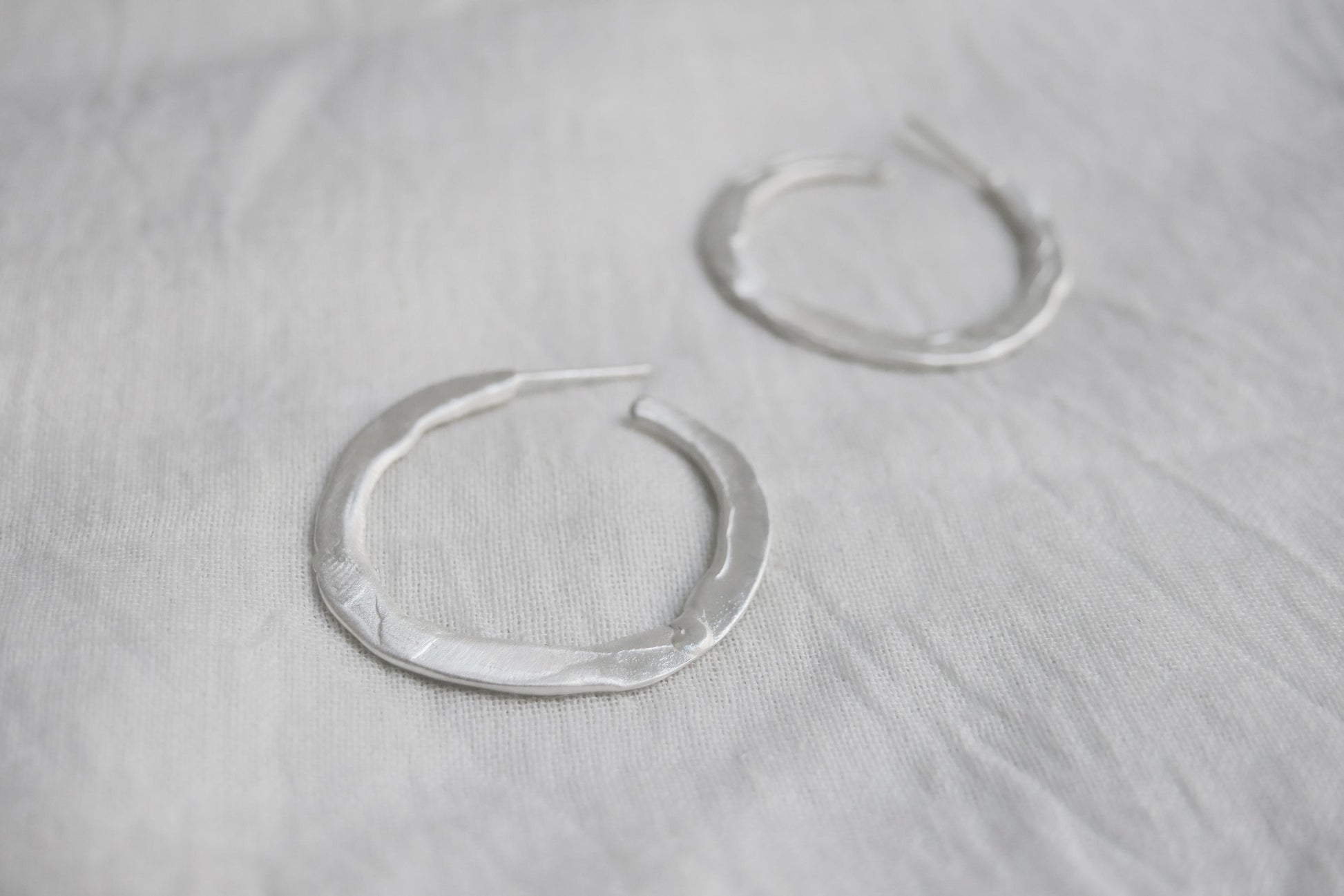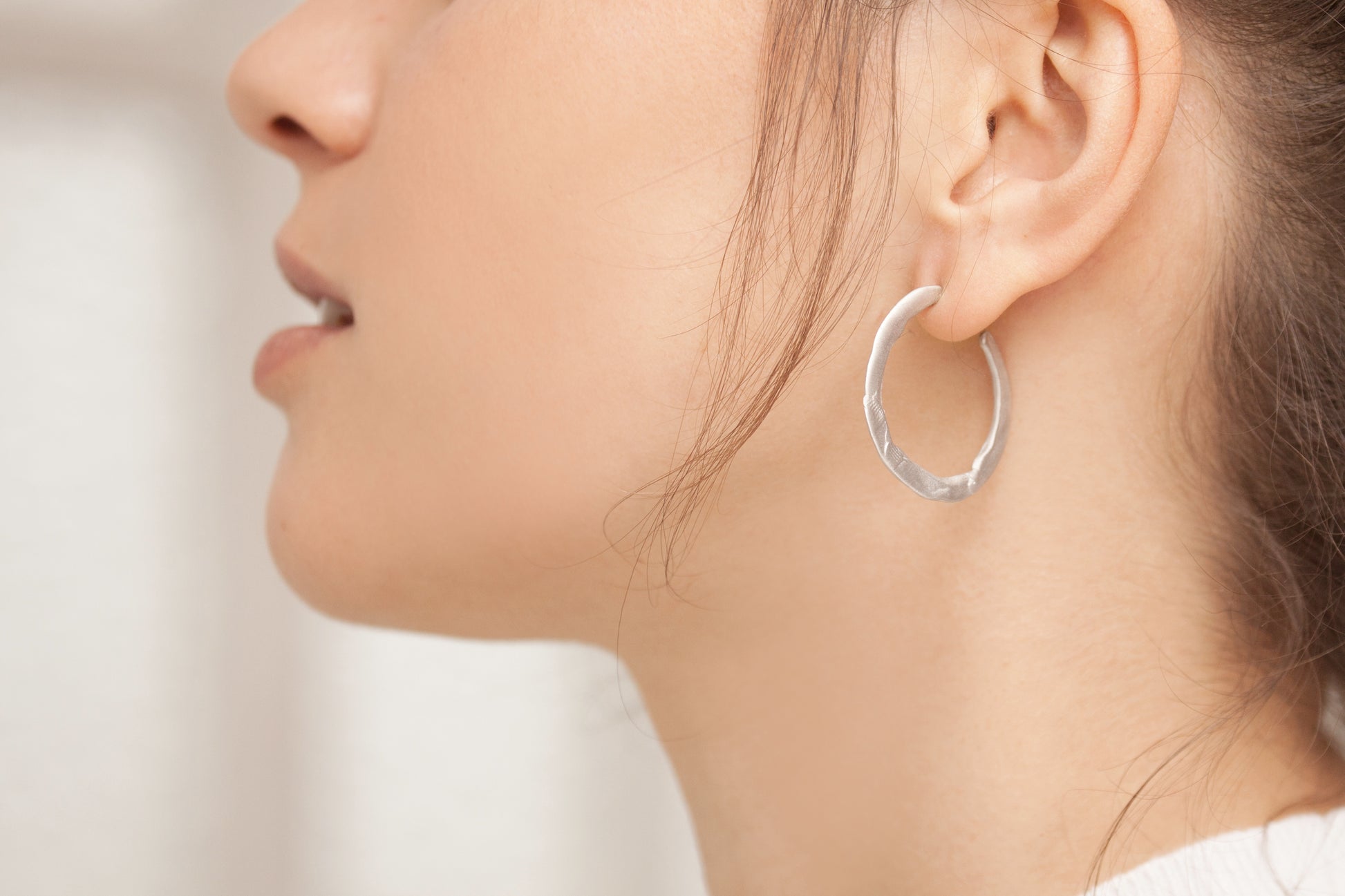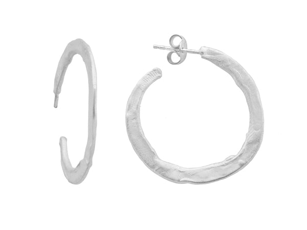 Aros medianos en plata con una textura similar a la de la plastilina trabajada manualmente. Cierre de presión.