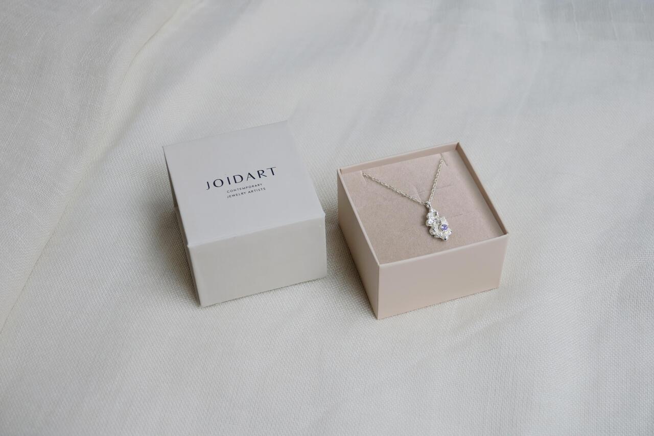 Collar con colgante pequeño de plata mate 925. Diseño inspirado en la textura de la arena con detalle de cristal en color violeta, que representa los pequeños tesoros brillantes enterrados en ella. Cadena de plata con cierre de mosquetón.
